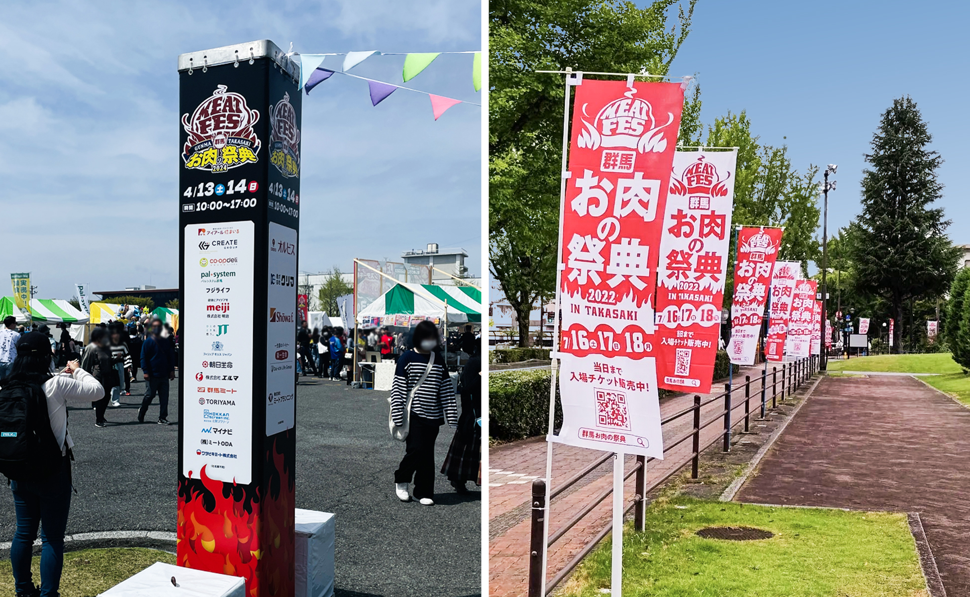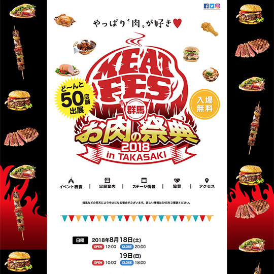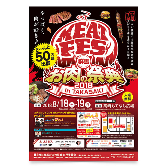 日本有数の食肉生産地である群馬県。その県産食材を使用した名店の傑作が集結した「群馬お肉の祭典」のイベントロゴから、当日パンフレット、ポスター、WEBサイト、うちわ、ステッカー、会場サイン等のトータルデザインを行いました。イベントロゴは来場者の燃えたぎる肉への情熱を形にしました。