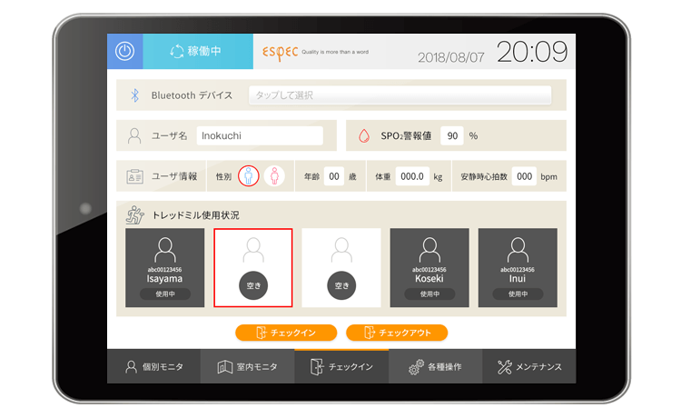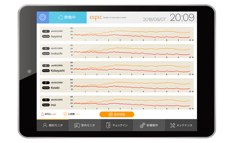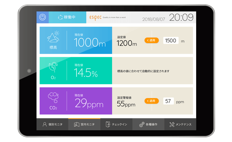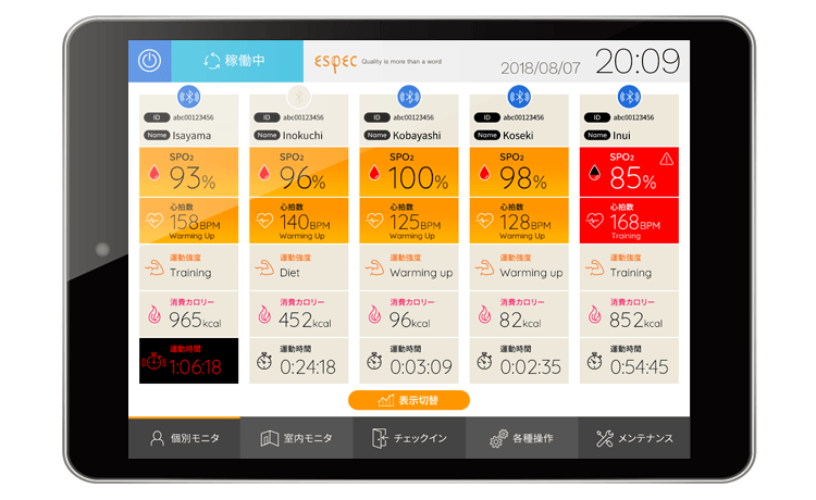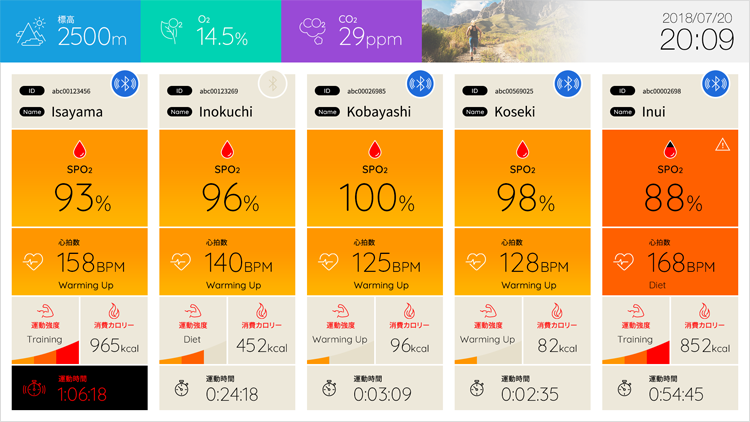トレーニングジムの低酸素トレーニングルームで使用するデジタルパネルのインターフェースをデザインしました。トレーニングルーム利用者が、自身の状況を確認するための壁掛けパネルと、インストラクターが使用するタブレットでの操作画面の2種類を作成。特に壁掛け画面は利用者の「気持ちが上がる」デザインを意識しました。