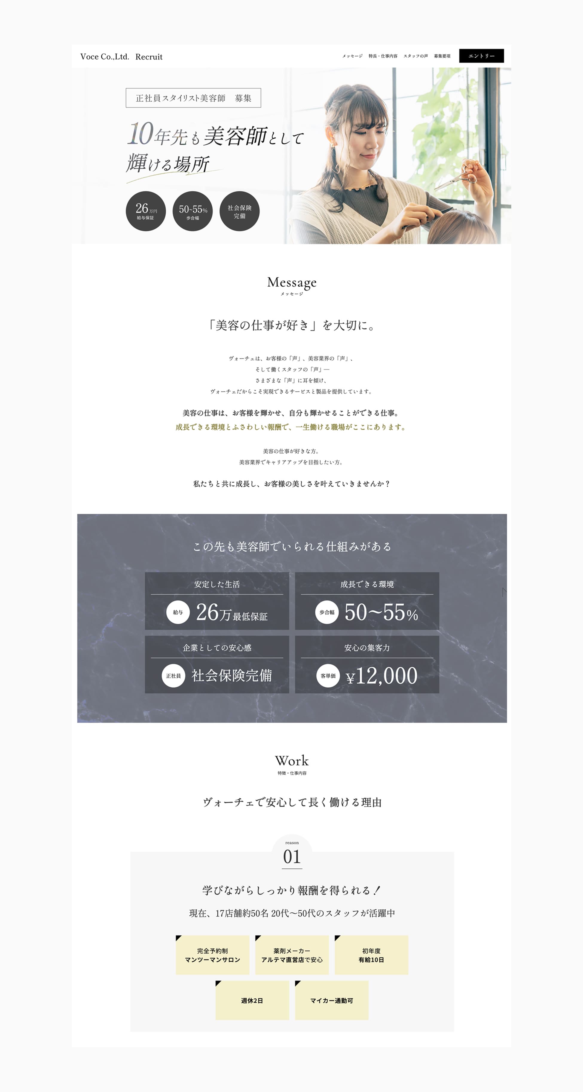お客様企業の経営理念である「時間を無駄にしない」という価値観に着目し、「髪と時を美しく。」というコピーを軸にブランドメッセージを再構築。取引先やお客様にとっての価値と、働くスタッフの誇りがどちらも伝わるよう、トーンやビジュアルの細部にまでこだわり、コーポレートサイトや会社案内パンフレット、動画を制作しました。